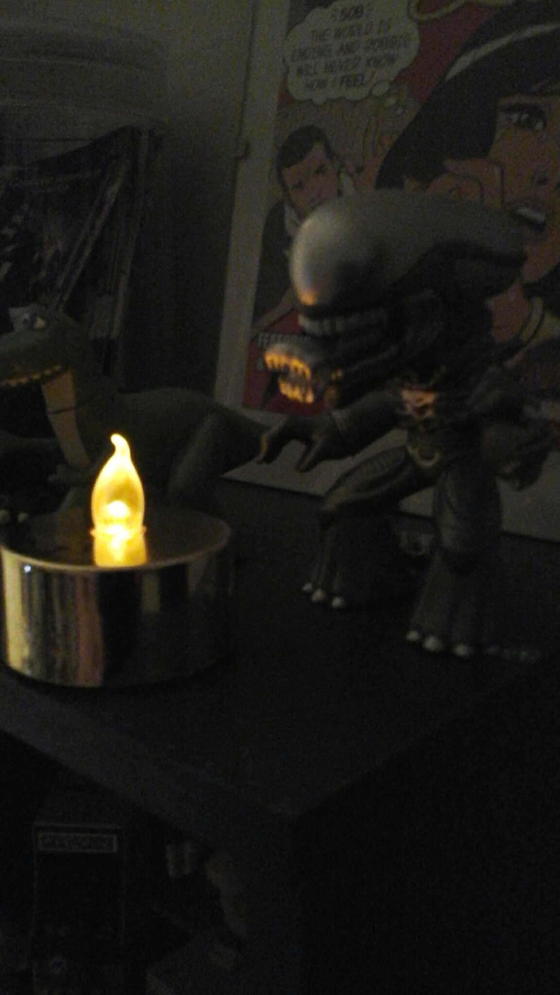 Alien vinyl mini from Funko. Toy Story dino (blanked on name, sorry) from thrift store. Secret Wars Secret Love promo card, free from my local comic store.