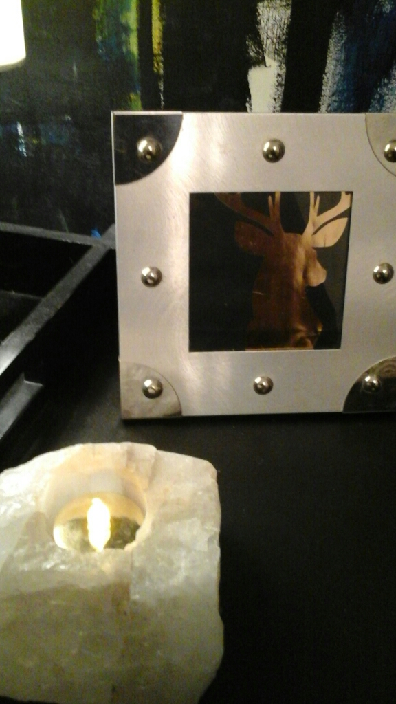 The quartz candle holder was from Home Goods a couple of years ago for about three bucks because it was on clearance. Gold mini (fake) candle from Dollar Tree, two to a package.