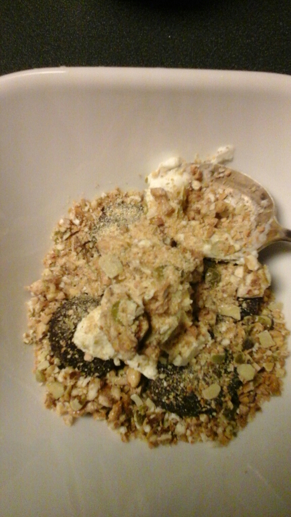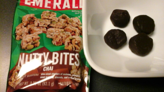 Remember those Emerald Nutty Bites from breakfast on Sunday? Take the last bits and crush them up. Hang onto them for a moment.