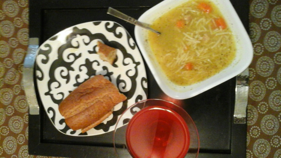 Homestyle Chicken Noodle soup from Campbell’s. A buttered wheat roll from Wawa (from last night’s stop there.) This morning’s tipple is Sparkling Ice‘s Cherry Limeade. (I really need to get the lime flavored one for tonight.)