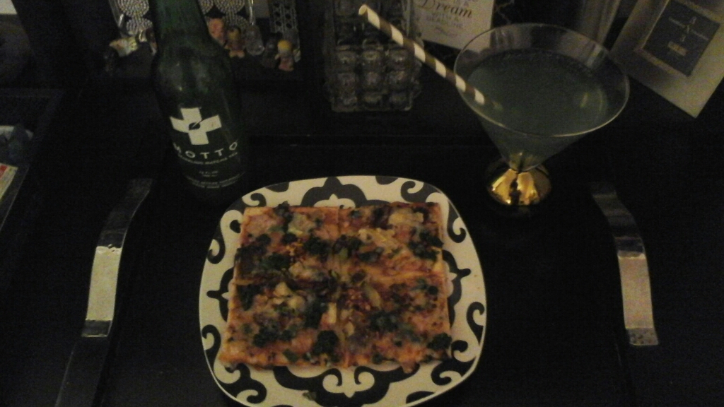 Motto green tea soda; Annie’s Light Spinach and Artichoke pizza. (I don’t know what’s light about it, but it tastes good.)