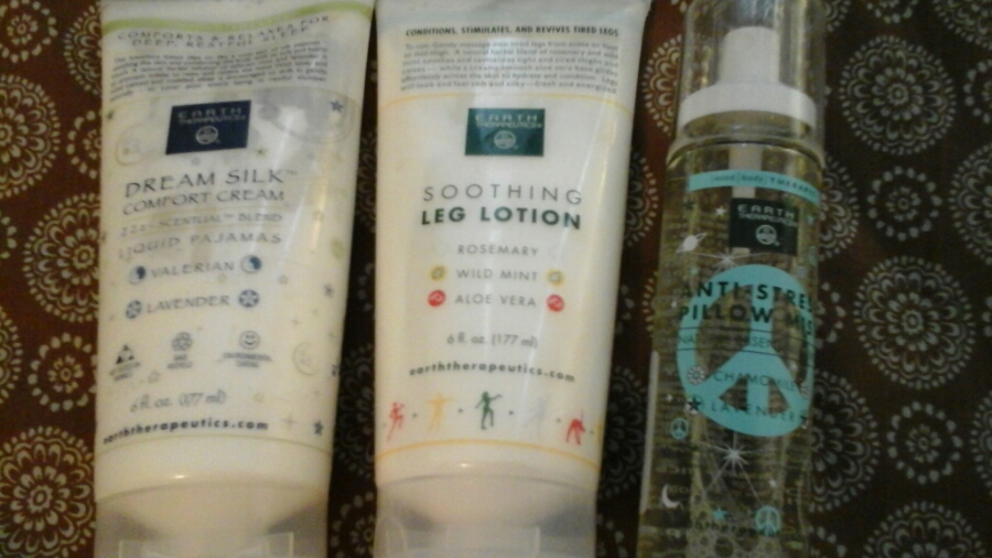 Sidenote: May I take this time to say that Earth Theraputics are some of the best products ever? I love the Valrian and Lavender in the Dream Silk Comfort Cream; the Rosemary, Wild Mint and Aloe Vera in the Soothing Leg Lotion; and oh yeah, the Chamomile and Lavender in the Anti-Stress Mist, above on the far right. (And no; I don’t get paid to say this. Silly Billy.)