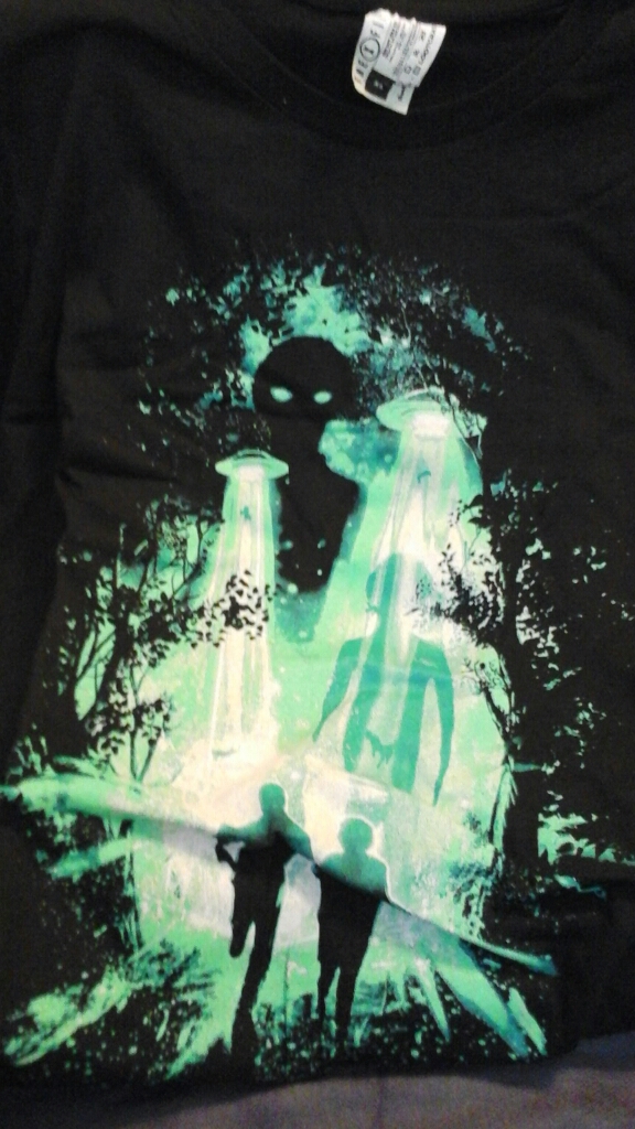 OMG! The tee shirt is an offricial The X-Files shirt! Mulder and Scully running from the Greys! I don’t think they ever had the classic saucer shaped ships on the show – but who cares? IT’S THE FREAKING X-FILES!