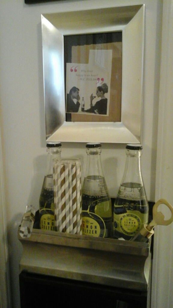 The silver frame came from the thrift store and was about a buck. The pic came from Glamour magazine — it’s a W.C. Fields quote, “Why limit happy to an hour?” — and I knew I wanted it over my bar. It’s not perfectly framed, but I think that gives it a modern charm.